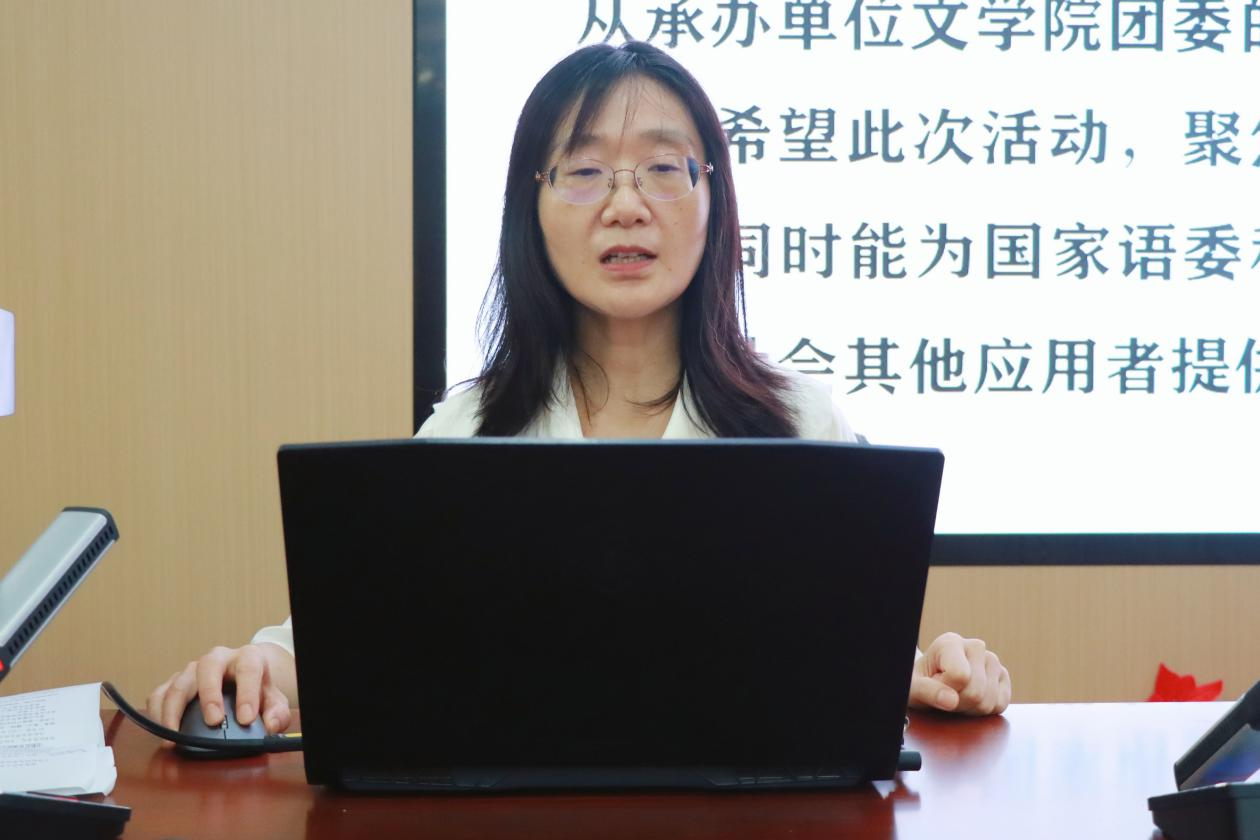 陈晖详细介绍了本年度大学生暑期推广国家通用语言文字社会实践活动的方案和内容,强调了专项活动的基本任务与注意事项。她期待同学们在此次活动中将专业知识与社会语言文字问题相结合,塑造乐观向上和勇于奉献的精神品格。